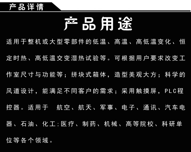 適用于整機或大型零部件的低溫、高溫、高低溫變化、恒定時熱、高低溫交變濕熱試驗等。可根據(jù)用戶要求改變工作室尺寸與功能等;拼塊式箱體,造型美觀大方;科學(xué)的風(fēng)道設(shè)計,能滿足不同客戶的需求;采用觸摸屏,PLC程控器。適用于 航空、航天、軍事、電子、通訊、汽車、電器、石油、化工;醫(yī)療、制藥、機械、高等院校、科研單位等各個領(lǐng)域;
