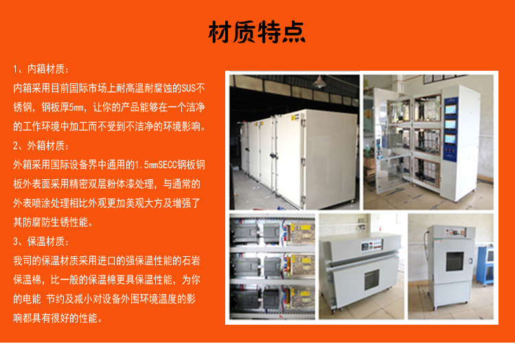 1、中創儀器采用的觸摸屏控制器,外觀大方美觀,控制精度高,穩定性能好;其它電控配件均采用進口品牌,使用壽命長,安全性能高,為客戶提供安全放心的設備;2、K型熱電偶溫度傳感器,精度高、感應溫度快、耐高溫、低維護;3、隔熱層采用耐高溫的硅酸鋁棉或巖棉隔熱保溫,設備保溫效果好,擴散溫度少,為客戶用電降低成本;4、采用耐高溫、噪音小、振動小電機,同時應用渦輪型風輪,風壓強風量大,有效的使箱內熱風循環流暢,使溫度均勻性高。